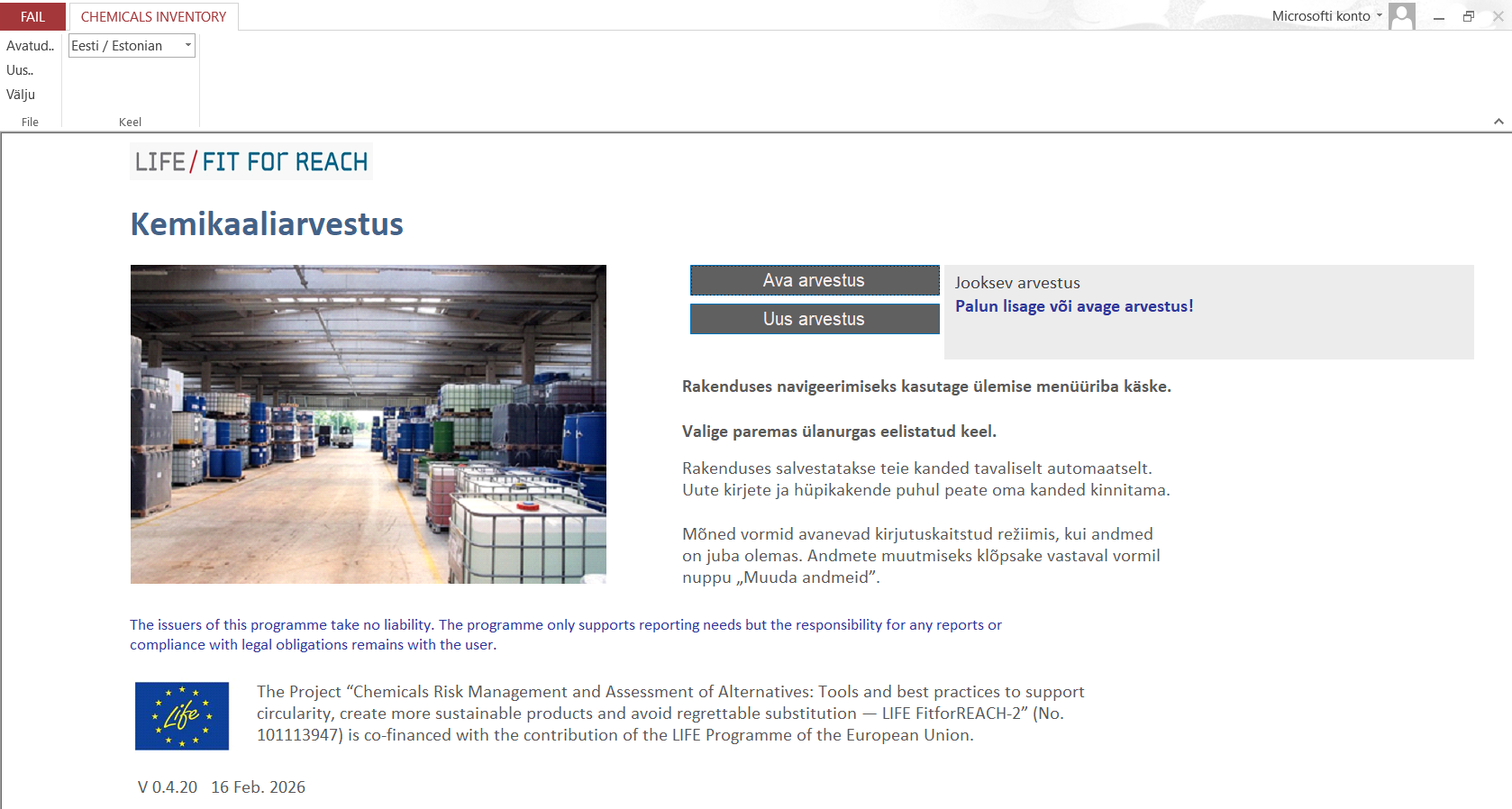 Kemikaaliarvestuse töövahendit saab kasutada MS Access®-i tasuta versiooniga (vt juhendit) ning see on saadaval lisaks eesti keelele ka inglise, läti, leedu, poola ja saksa keeles.